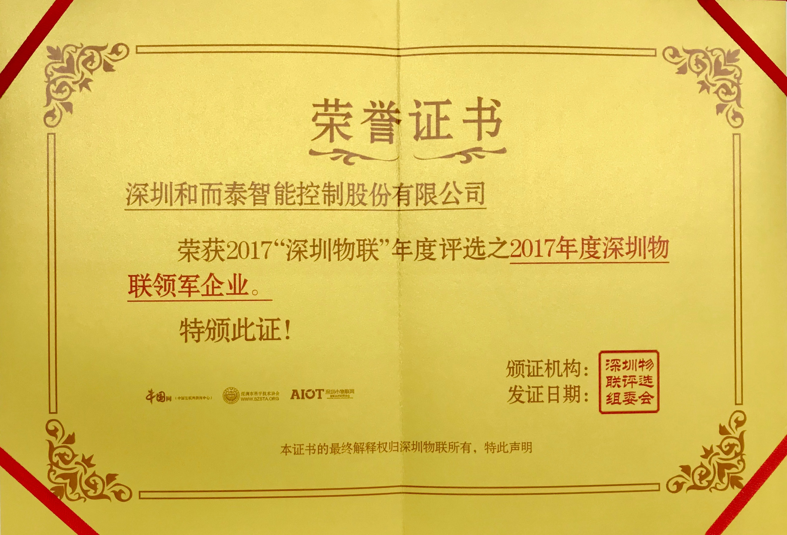 △“2017年度深圳物聯(lián)領(lǐng)軍企業(yè)”榮譽(yù)證書(shū)